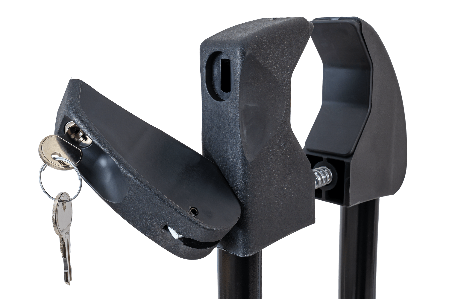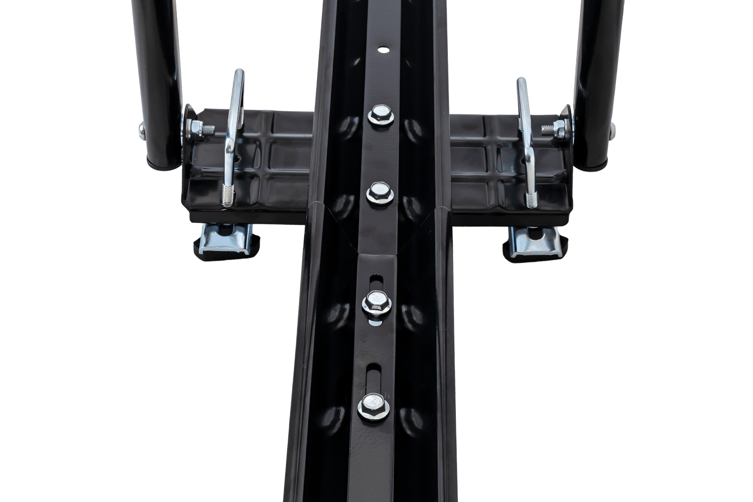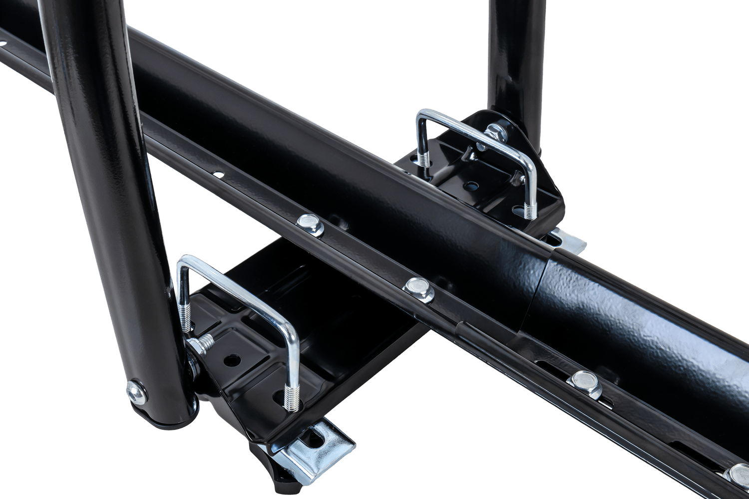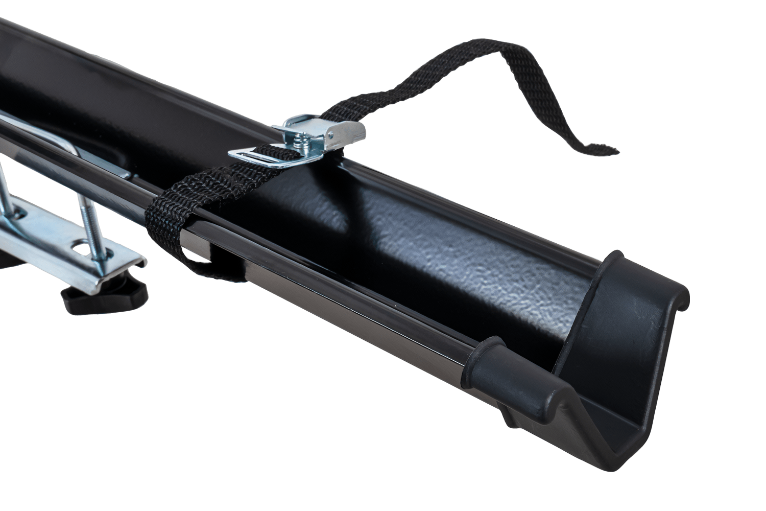 Rower w tym uchwycie jest mocowany w 3 punktach - za ramę i za koła, bagażnik jest wyposażony w wygodne zamknięcie umożliwiające zablokowanie ramy rowery jednym ruchem z zamkiem zabezpieczającym rower. Dzięki głębokiej rynience która ułatwia montaż, rower również zachowuje się stabilniej podczas montażu i jazdy samochodem. Mocna, stalowa konstrukcja zapewnia stabilność i bezpieczeństwo. W zestawie znajdują się dwa paski mocujące koła roweru.