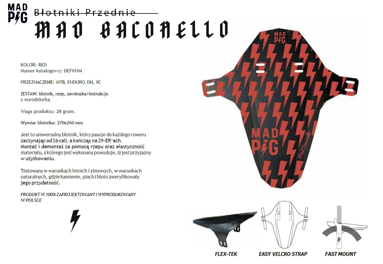 Przedni błotnik Mad Baconello jest inny od swojego brata Mad Bacon’a. Cechuje go dłuższy front oraz tył, dodatkowo zostały nałożone nacięcia mające na celu zmniejszyć naprężenia oraz dodatkowo usztywnić błotnik, profilując jego kształt. Pasuje na różne koła - począwszy od 26 cali, a na 29-ER’ach skończywszy. Montaż i demontaż za pomocą rzepu oraz elastyczność materiału, z którego jest wykonany powoduje, iż jest przyjazny w użytkowaniu.