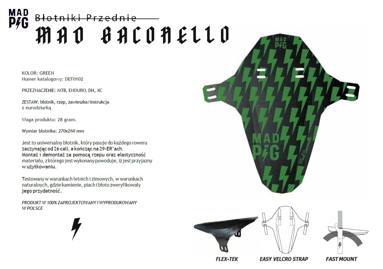 Przedni błotnik Mad Baconello jest inny od swojego brata Mad Bacon’a. Cechuje go dłuższy front oraz tył, dodatkowo zostały nałożone nacięcia mające na celu zmniejszyć naprężenia oraz dodatkowo usztywnić błotnik, profilując jego kształt. Pasuje na różne koła - począwszy od 26 cali, a na 29-ER’ach skończywszy. Montaż i demontaż za pomocą rzepu oraz elastyczność materiału, z którego jest wykonany powoduje, iż jest przyjazny w użytkowaniu.