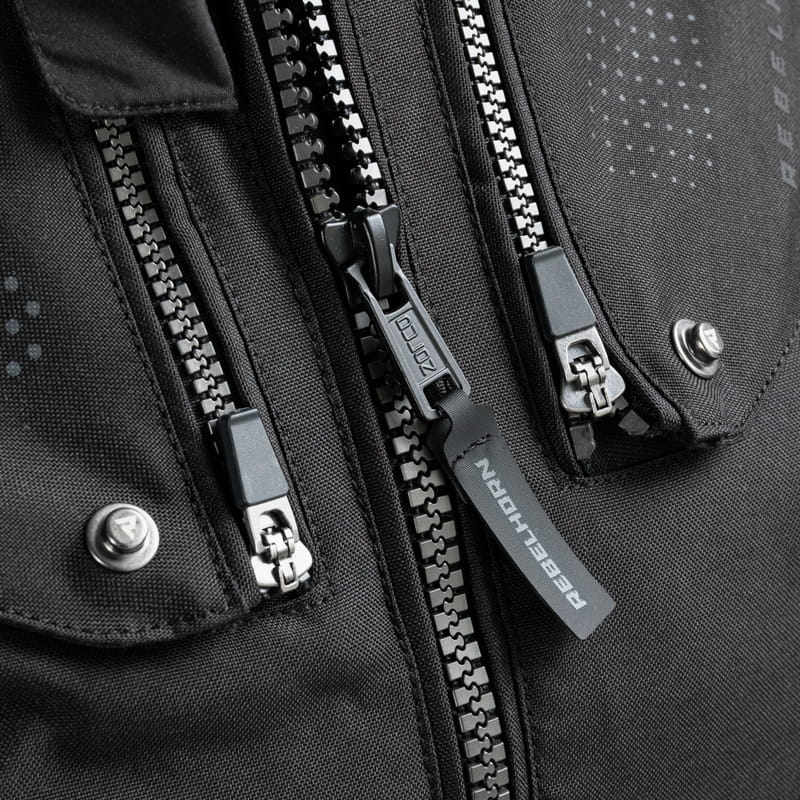 - Zamki łączące typu 8VST: Dwa rodzaje zamków (360 oraz krótki) do łączenia kurtki ze spodniami,