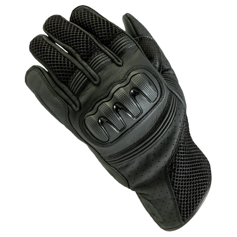 Rękawice motocyklowe ze skóry koziej z podszewką micro mesh, perforacją na dłoni i palcach i panelem polepszający chwyt kierownicy. Pod osłoną kostek znajdują się panele SAS-TEC. Wewnętrze uszyte z podwójnego materiału. Zewnętrzne szwy i elastyczne elementy zwiększają komfort użytkowania.