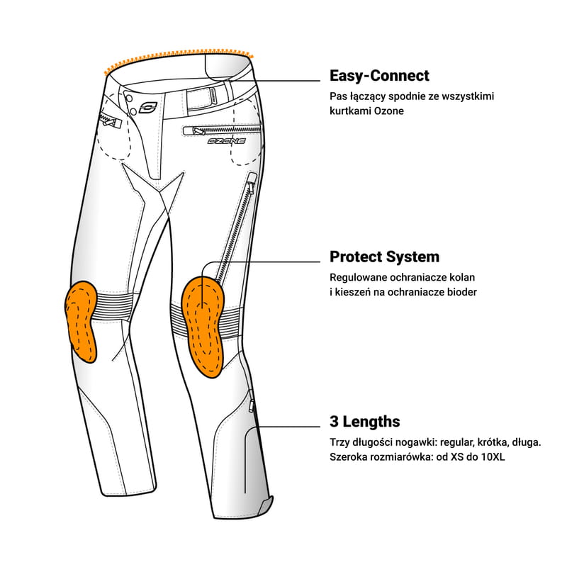 - Wytrzymałe i funkcjonalne zamki (360° oraz krótki) umożliwiają połączenie spodni z kurtką
