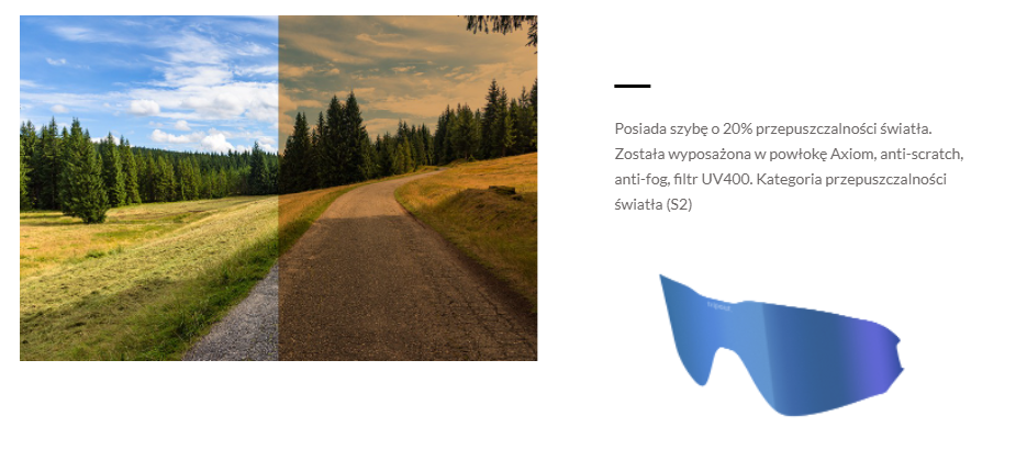 - 20% przepuszczalności światła (kategoria S2) - soczewki ochronią nasz wzrok przed intensywnymi promieniami słonecznymi oraz zachowają dobra widoczność podczas gorszych warunków do jazdy na rowerze jak deszcz czy zachmurzenie.