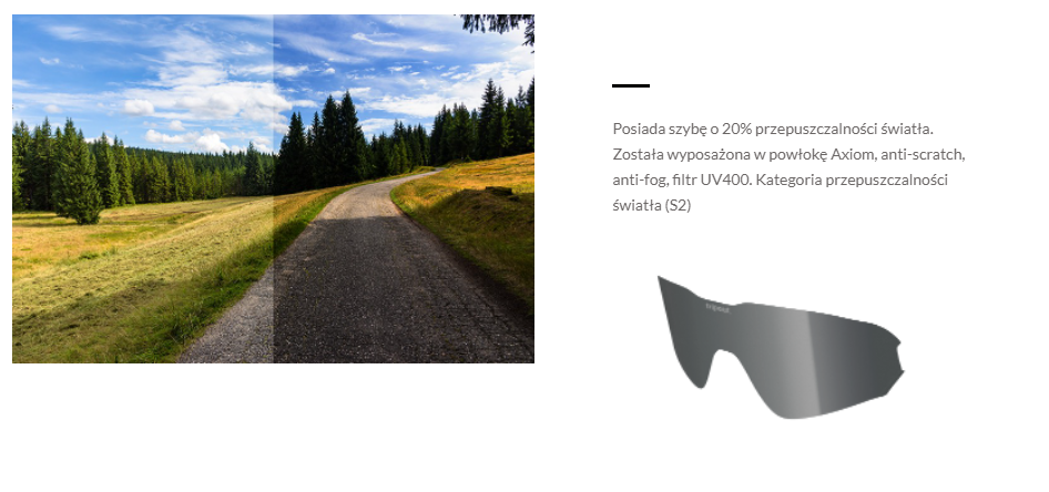 - 20% przepuszczalności światła (kategoria S2) - soczewki ochronią nasz wzrok przed intensywnymi promieniami słonecznymi oraz zachowają dobra widoczność podczas gorszych warunków do jazdy na rowerze jak deszcz czy zachmurzenie.