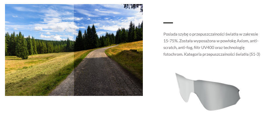 - 15-75 % przepuszczalności światła zależnie od panujących warunków atmosferycznych (kategoria S1-S3) - soczewki ochronią nasz wzrok przed intensywnymi promieniami słonecznymi oraz zachowają dobrą widoczność podczas gorszych warunków do jazdy na rowerze.