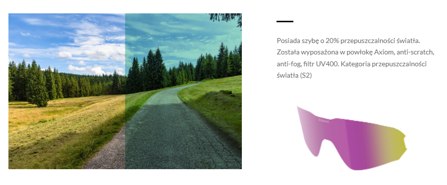 20% przepuszczalności światła (kategoria S2) - soczewki ochronią nasz wzrok przed intensywnymi promieniami słonecznymi oraz zachowają dobra widoczność podczas gorszych warunków do jazdy na rowerze jak deszcz czy zachmurzenie.