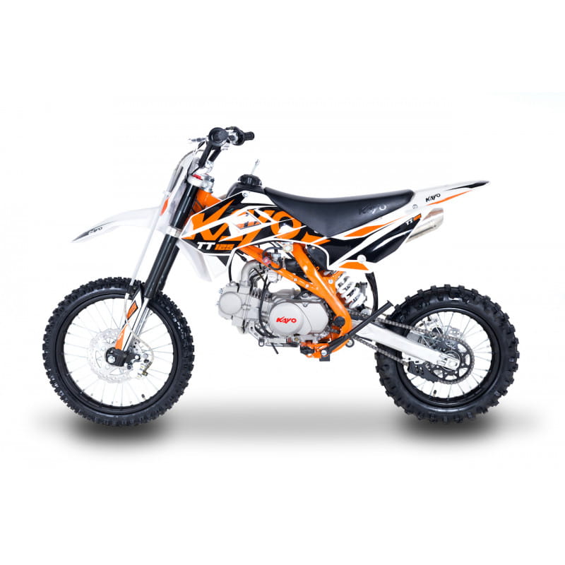 KAYO 125 TT to pierwszy poważny pit bike dla nastolatków przesiadających się z innych modeli, ale także sprzęt, na którym można postawić pierwsze kroki. Manualna, 4-biegowa skrzynia biegów uczy poprawnych nawyków, a dzięki kołom w rozmiarze 17” z przodu i 14” z tyłu dla 125 TT żaden teren nie jest straszny. Moc? Odpowiednia by się dobrze bawić.